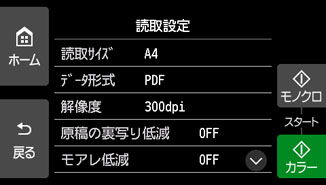 印刷物は細かな点の集まりで文字やグラフなどを表現しています。モアレとは、この点と点の干渉によって濃淡のむらや縞模様が出る現象です。スキャンした文書を確認してモアレがあるときは[ON]に設定します。