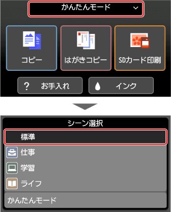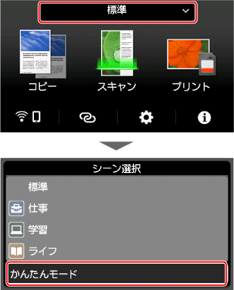 ホーム画面のシーン選択で[かんたんモード]を選ぶと、かんたんモードに切り替えることができます。