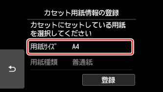 カセットにセットした用紙に合わせて[用紙サイズ]を設定し、[登録]を選ぶ