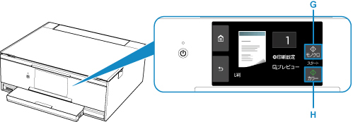 用紙の設定を確認して、モノクロボタン(G)またはカラーボタン(H)を押す