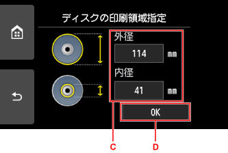 [外径]または[内径](C)を選び、印刷領域を設定して[OK](D)を選びます。