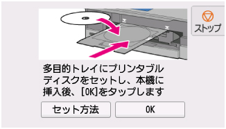 プリンタブルディスクのセットを促すメッセージが表示されるまでは、多目的トレイはセットしないでください。動作中に多目的トレイをセットするとプリンターを損傷するおそれがあります。