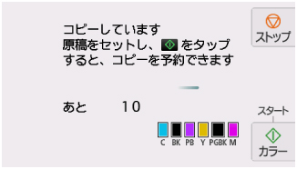 • 原稿の読み取り中に[コピーを予約できませんでした 最初からやり直してください]と表示された場合は、[OK]を選んでから、[ストップ]をタップし、いったんコピーを中止してください。そのあと、コピーできなかった原稿からコピーし直してください。