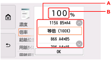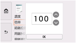 コピー待機画面で[印刷設定]を選んで印刷設定画面を表示し、[倍率]を選ぶと拡大/縮小方法が表示されます。倍率を指定して、[OK]を選びます。
