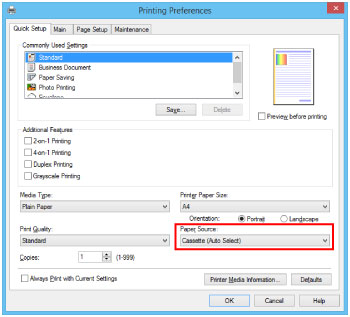 Selecteer bij Papierbron (Paper Source) de cassette waarin het papier is geplaatst.