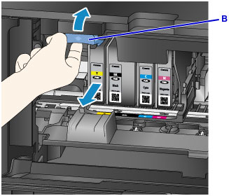 Når det blir angitt på LCD-skjermen at en blekktank må skiftes, skyver du opp utløserhendelen for blekktanken (B).