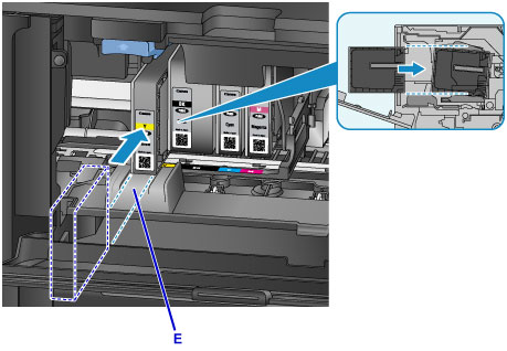 Sett inn den nye blekktanken, og juster den i forhold til monteringsskinnen (E) på skriveren.