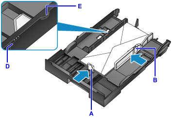 Skyv den høyre papirføreren (B) for å justere de høyre og venstre førerne mot begge sidene av konvoluttene.