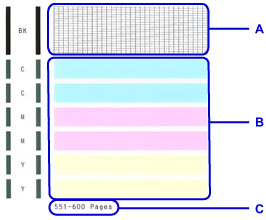 Kontroller om det mangler linjer i mønsteret A eller om det er vannrette, hvite striper i mønsteret B.