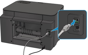 Hvis du konfigurerer trådløs LAN-tilkobling eller endrer innstillingene for trådløst LAN ved hjelp av en USB-tilkobling, kobler du til skriveren og datamaskinen ved hjelp av en USB-kabel som vist i illustrasjonen nedenfor. Du finner USB-porten på siden av skriveren.