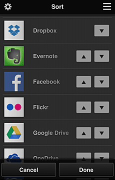 Tryk på knapperne op og ned for at ændre visningsrækkefølgen for apps. Når du er færdig med sortere, skal du vælge Udført (Done).