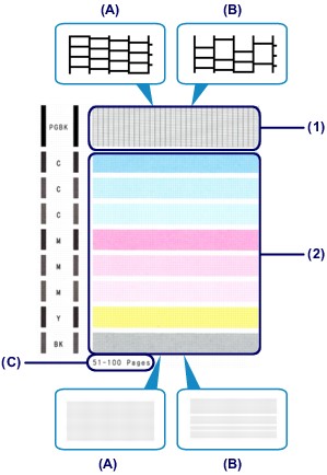 For (A) (no missing lines or no horizontal white streaks) in both the pattern (1) and pattern (2):