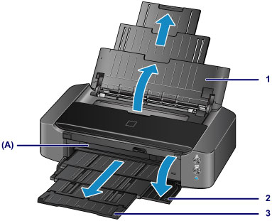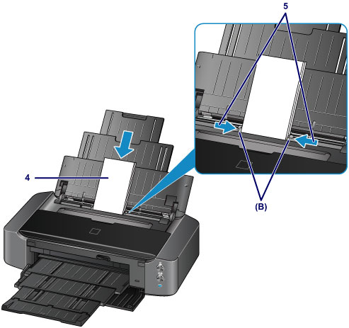 Slide the paper guides (B) to open them, and load the paper in the center of the rear tray WITH THE PRINT SIDE FACING YOU.