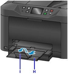 Ištraukite išvesties dėklo ilgintuvą (H), tada atidarykite popieriaus išvesties atramą (I).