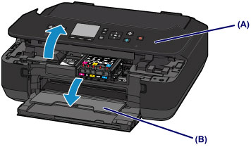 Atidarykite valdymo skydelį (A), tada atidarykite popieriaus išvesties dėklą (B).