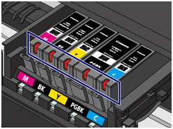 Įsitikinkite, kad rašalo talpykla įdėta tinkamoje vietoje, kaip parodyta spausdinimo galvutės laikiklio lipduke. Jei vieta tinkama, bet lemputė mirksi, įvyko klaida, dėl kurios įrenginiu negalima spausdinti. Perskaitykite LCD rodomą klaidos pranešimą.