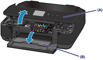 Otvorite radnu ploču (A), a zatim otvorite ladicu za izlaz papira (B).