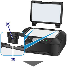 Oba tečaja (A) pokrova za dokumente nastavite v držali (B) in ju navpično vstavite v pokrov za dokumente, kot je prikazano spodaj.