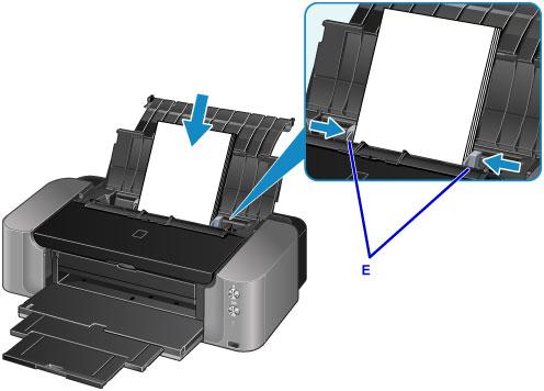 6. Bīdiet papīra vadotnes (E), lai tās atvērtu, un novietojiet papīru aizmugures paliktņa centrā AR APDRUKĀJAMO PUSI PRET SEVI.