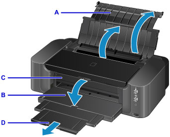 Odprite oporo za papir (A) na zadnjem pladnju.