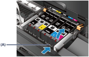 Paspauskite fiksatorių (A) ir keldami išimkite rašalo talpyklą.