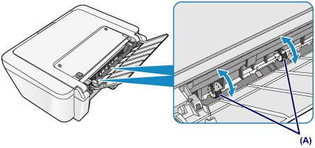 If the problem is not resolved after cleaning the paper feed rollers (A) in the rear tray, turn off the power, unplug the power cord, then wipe the paper feed rollers (the center roller and the right roller) located inside the rear tray with a moistened cotton swab or the like while rotating them manually. Do not touch the rollers with your fingers. Rotate the rollers two or more times.