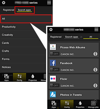 NoteOn the Search apps screen, the apps that you can register by using the Canon Cloud Printing Center are displayed by category.