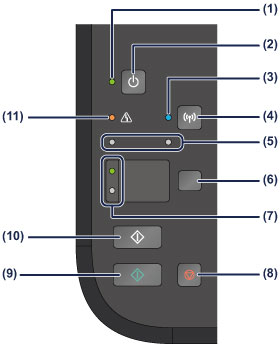Lights or flashes orange when an error occurs, such as paper-out or ink-out. When performing machine maintenance or machine settings, options can be selected according to the number of flashes.