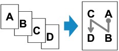 Če v razdelku Kopiranje (Copy) za možnost Post. (Layout) izberete Kopija 4 na 1 (4-on-1 copy), lahko štiri strani izvirnika kopirate na en list papirja, tako da zmanjšate vse slike. Na voljo so štiri različne postavitve.
