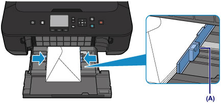 (5) Paslinkite dešinįjį popieriaus kreipiklį (A), kad sulygintumėte popieriaus kreipiklius su abiem vokų kraštais.