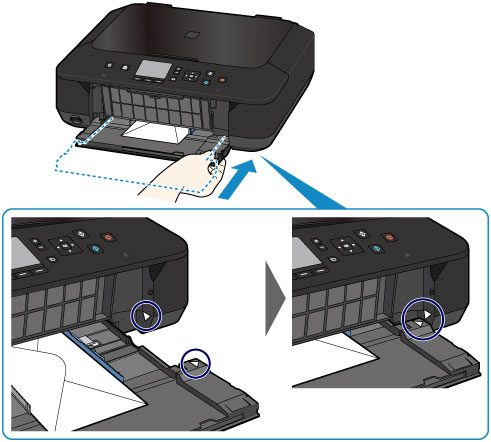 (5) Paslinkite dešinįjį popieriaus kreipiklį (A), kad sulygintumėte popieriaus kreipiklius su abiem vokų kraštais.
