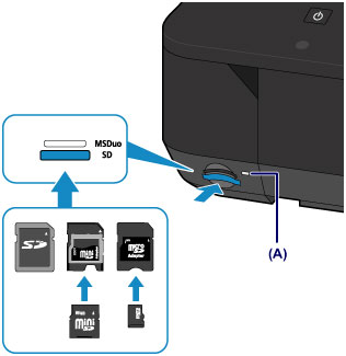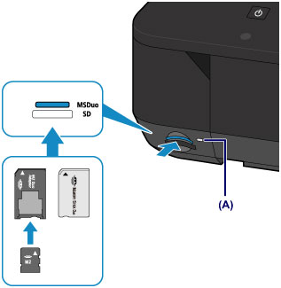 Tinkamai įdėjus atminties kortelę užsidega lemputė Prieiga (Access) (A).