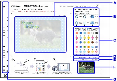手書きエリアに印刷された定型のイラストに文字や絵を重ねて書いた場合、文字修飾の効果やフチなどが正しく印刷できない場合があります。イラストに文字や絵を重ねて書かないようにしてください。