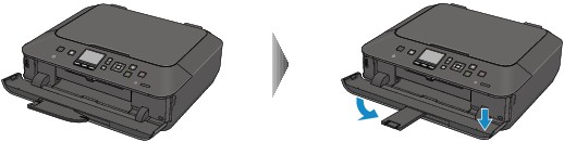 排紙トレイをおさえながら、補助トレイをカチッと音がするまで、ゆっくりと元の位置に戻してください。