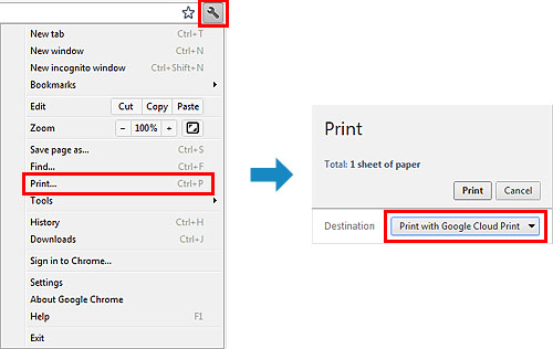 下の図は、Google Cloud Printが利用できるウェブブラウザーから印刷するときの画面の例です。Google Cloud Printに対応したアプリやサービスによって印刷するときの画面は異なります。