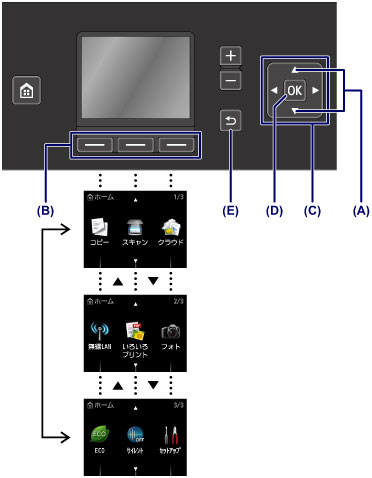 ボタン(C)で項目や設定を選び、OKボタン(D)を押して操作を進めます。