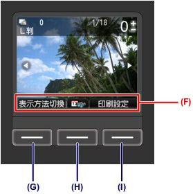 液晶モニターの画面の下部には、ファンクションメニュー(F)が表示されます。ファンクションメニューの機能を使用する場合は、メニューに対応したファンクションボタン(G)(H)(I)を押します。