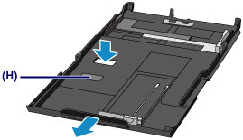 カセット(下段)にA4サイズより大きい用紙をセットする場合は、カセット(下段)のロック(H)を押して、手前に引き出します。