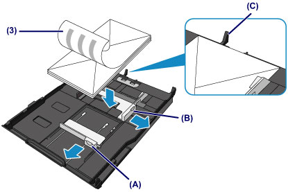 右の用紙ガイド(B)を動かし、封筒の両端に合わせます。