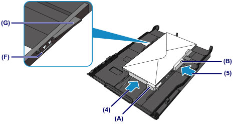 - 封筒は用紙ガイドのツメ(G)より下にセットしてください。
