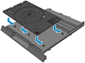 - ディスクトレイのそれぞれの穴が、カセット(上段)の裏面のツメに合うように差し込んでください。ディスクトレイが正しく取り付けられていないと、カセット(上段)を本体に差し込んだときにディスクトレイが破損するおそれがあります。