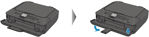排紙トレイをおさえながら、補助トレイをカチッと音がするまで、ゆっくりと元の位置に戻してください。