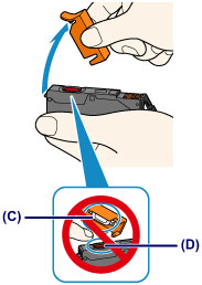 Ne dotikajte se notranjosti oranžnega zaščitnega pokrovčka (C) in ne odprte odprtine za črnilo (D). Če se ju dotikate, si lahko umažete roke s črnilom.