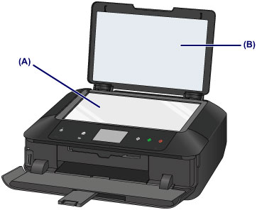 Почистете внимателно с мека, чиста и суха кърпа стъклото на скенера (A) и вътрешната част на капака за документи (бял лист) (B). Уверете се, че няма да остане нищо, особено по стъклената повърхност.