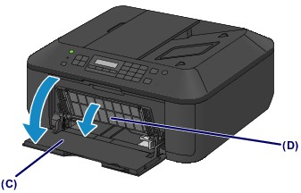 Įsitikinkite, kad įjungtas maitinimas, atsargiai atidarykite priekinį dangtį (C), tada atidarykite popieriaus išvesties dėklą (D).