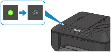 Norėdami atjungti maitinimo laidą, paspauskite mygtuką Įjungti (ON) ir įsitikinkite, kad nedega lemputė MAITINIMAS (POWER). Jei maitinimo laidą atjungsite dar neužgesus lemputei MAITINIMAS (POWER), spausdinimo galvutė gali uždžiūti arba užsikimšti ir dėl to gali suprastėti spausdinimo kokybė.