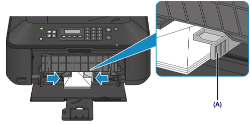 (4) Paslinkite dešinįjį popieriaus kreipiklį (A), kad sulygintumėte popieriaus kreipiklius su abiem vokų kraštais.