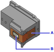 Nelieskite kasetės FINE elektrinių kontaktų (A) arba spausdinimo galvutės purkštuko (B). Įrenginys gali spausdinti netinkamai, jeigu jį liesite.