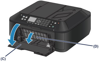 Įsitikinkite, kad įjungtas maitinimas, atsargiai atidarykite priekinį dangtį (C), tada atidarykite popieriaus išvesties dėklą (D).
