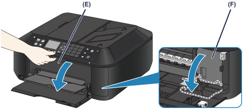 Atidarykite popieriaus išvesties dangtį (E).